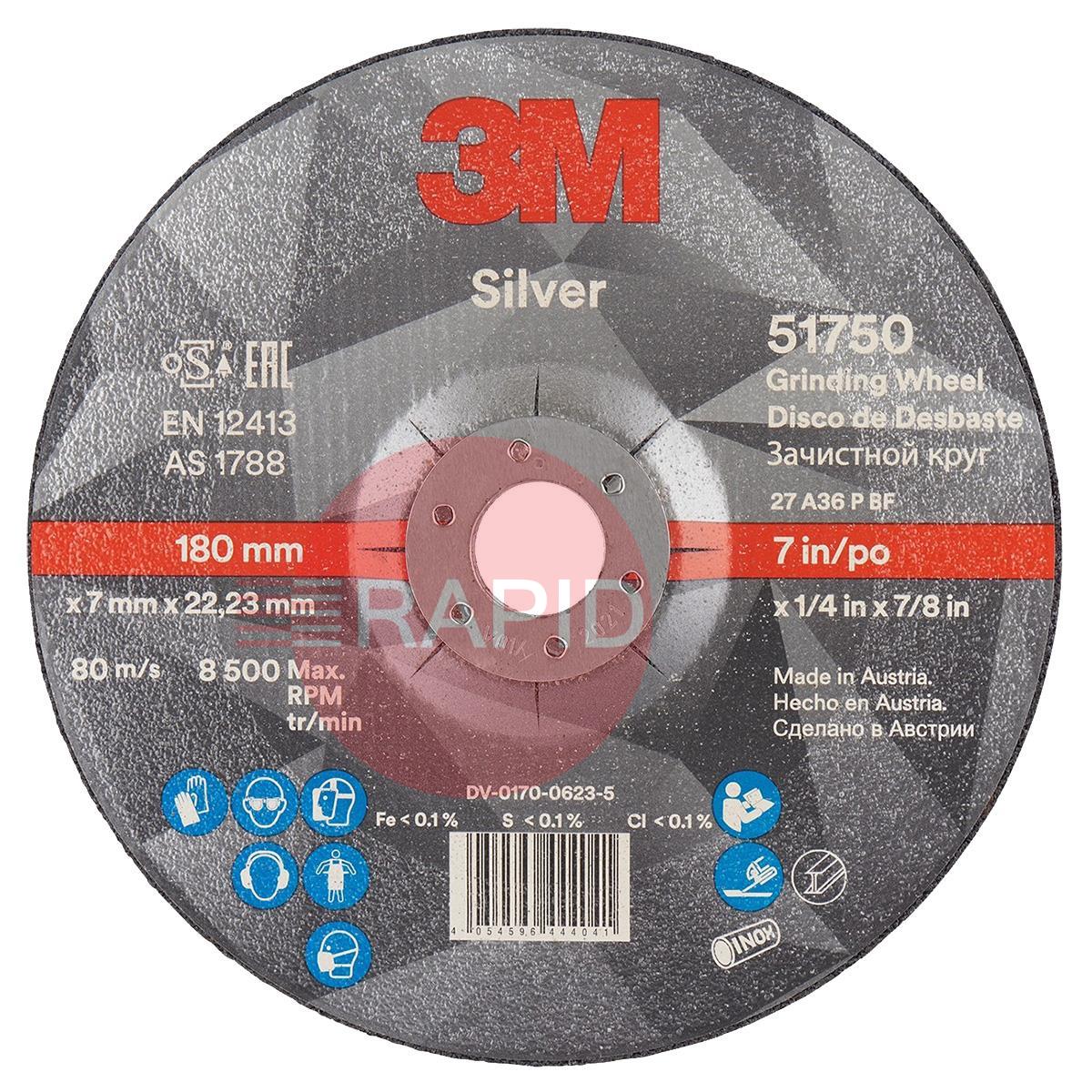 • 3M-51750  3M Silver Depressed Centre Grinding Wheel 178mm x 7mm x 22.23mm (Box of 10)