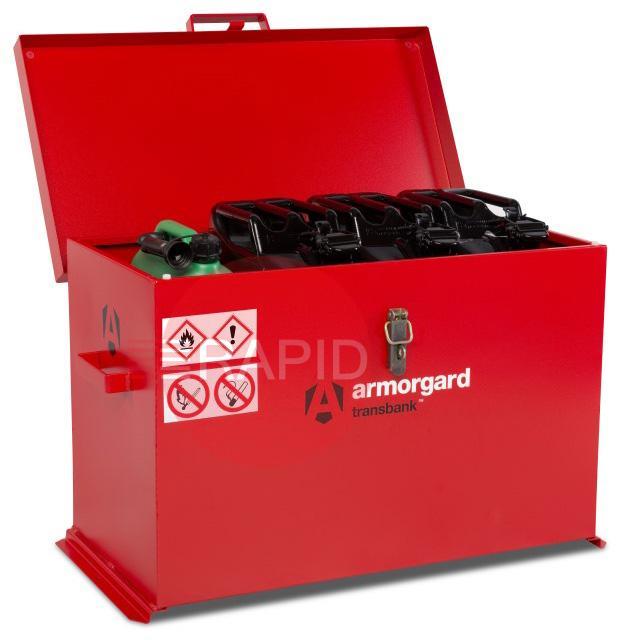 Transbank Hazardous Transit Box 880mm x 485mm x 540mm, designed specifically for storing or transporting smaller quantities of flammables or chemicals, fully complies with all regulations. Designed around the sizes of ‘jerry’ cans and 5-litre fuel and chemical cans, TRB4 will hold 4 x 20-litre Jerry Cans.