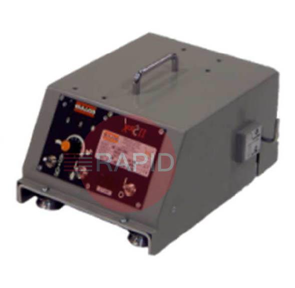 A light-duty, all-position variable speed travel carriage with electronic drive, dynamic braking and speed potentiometer providing infinite speed selection within the range of 2-45 ipm (5-114cm/min). It is equipped with a Forward/Reverse switch, a Run/Stop switch, 1 amo, a slow-blow fuse, and a “power on” pilot light. The carriage is designed to run only on rigid, straight Kat tracks. It has a vertical load capacity of 50lbs (23Kg).