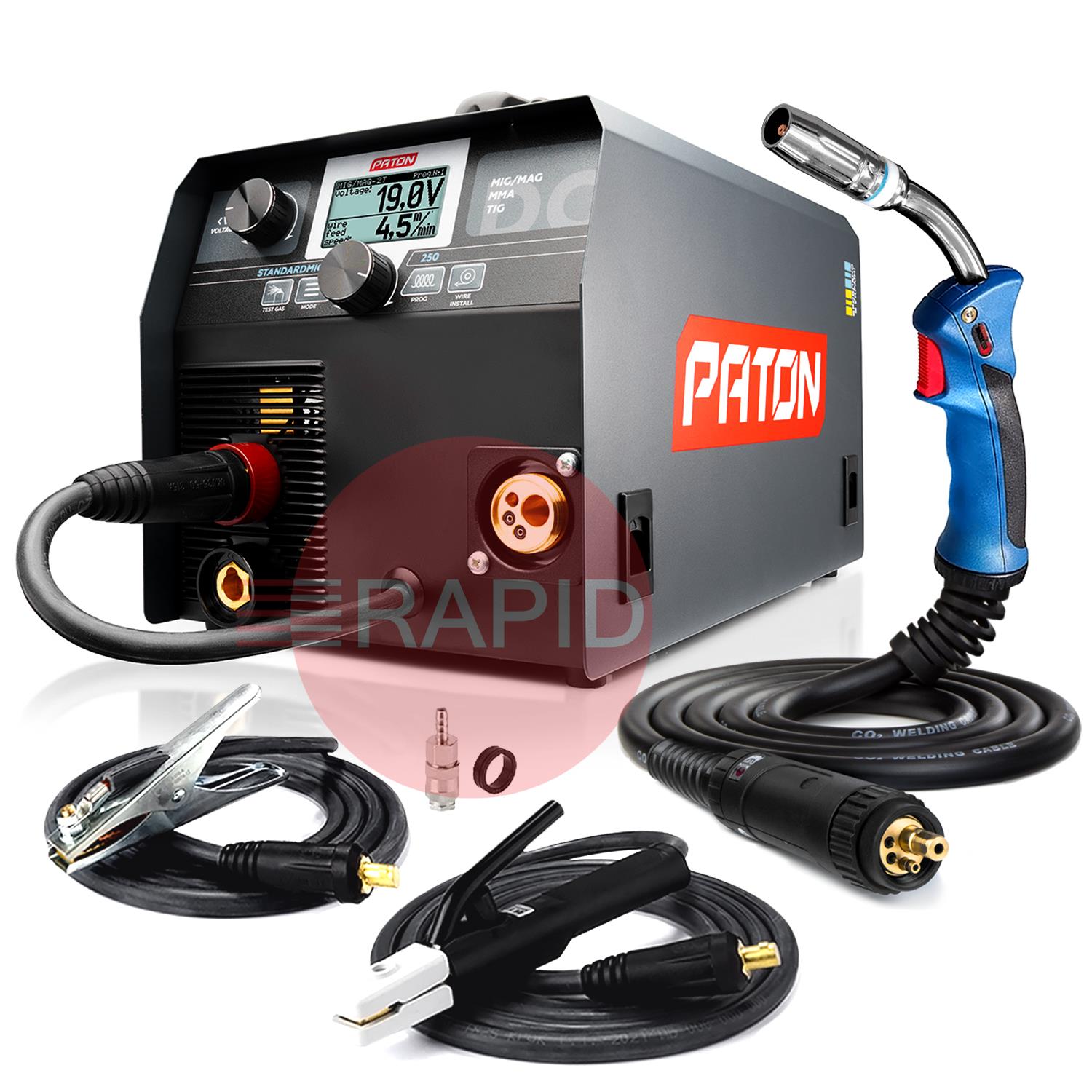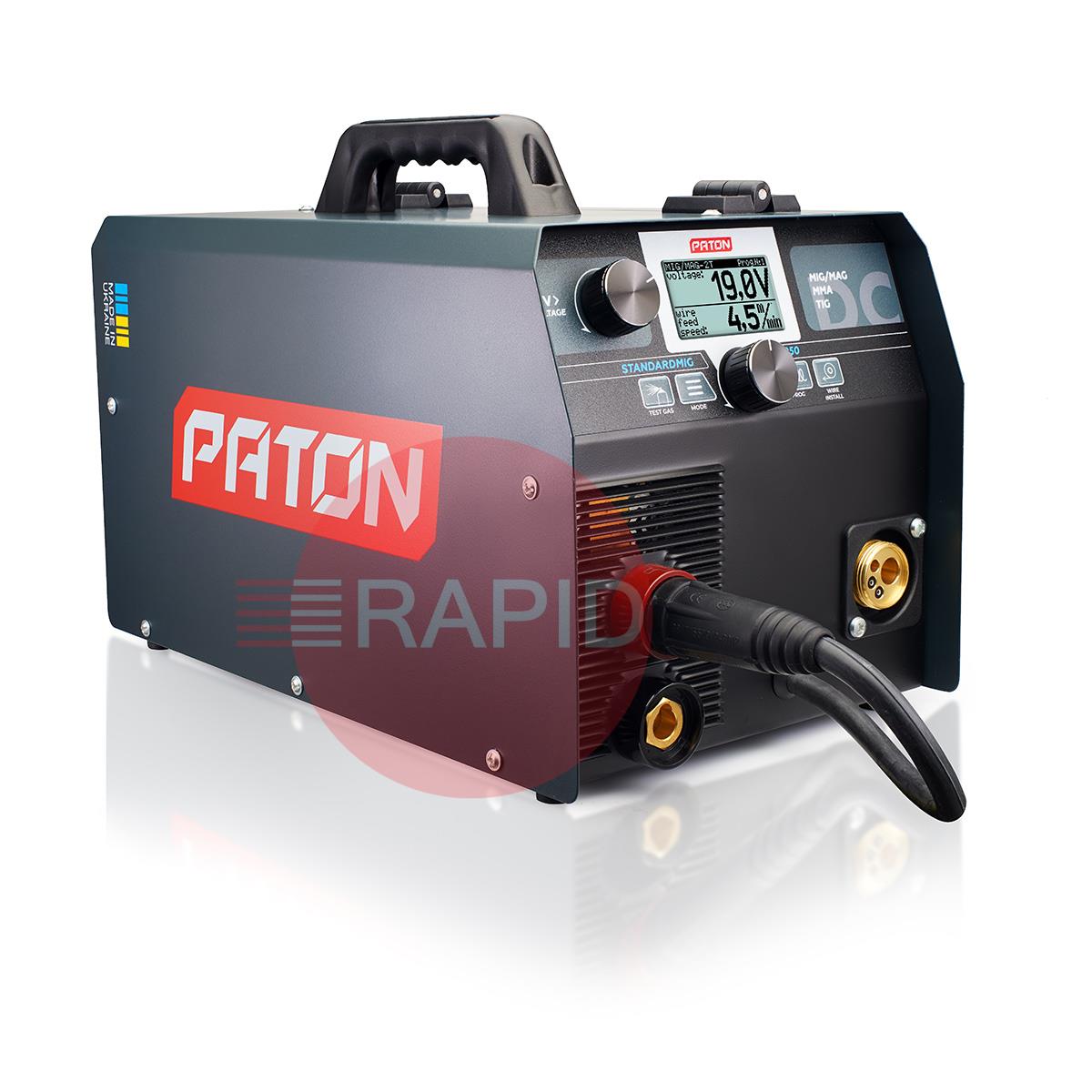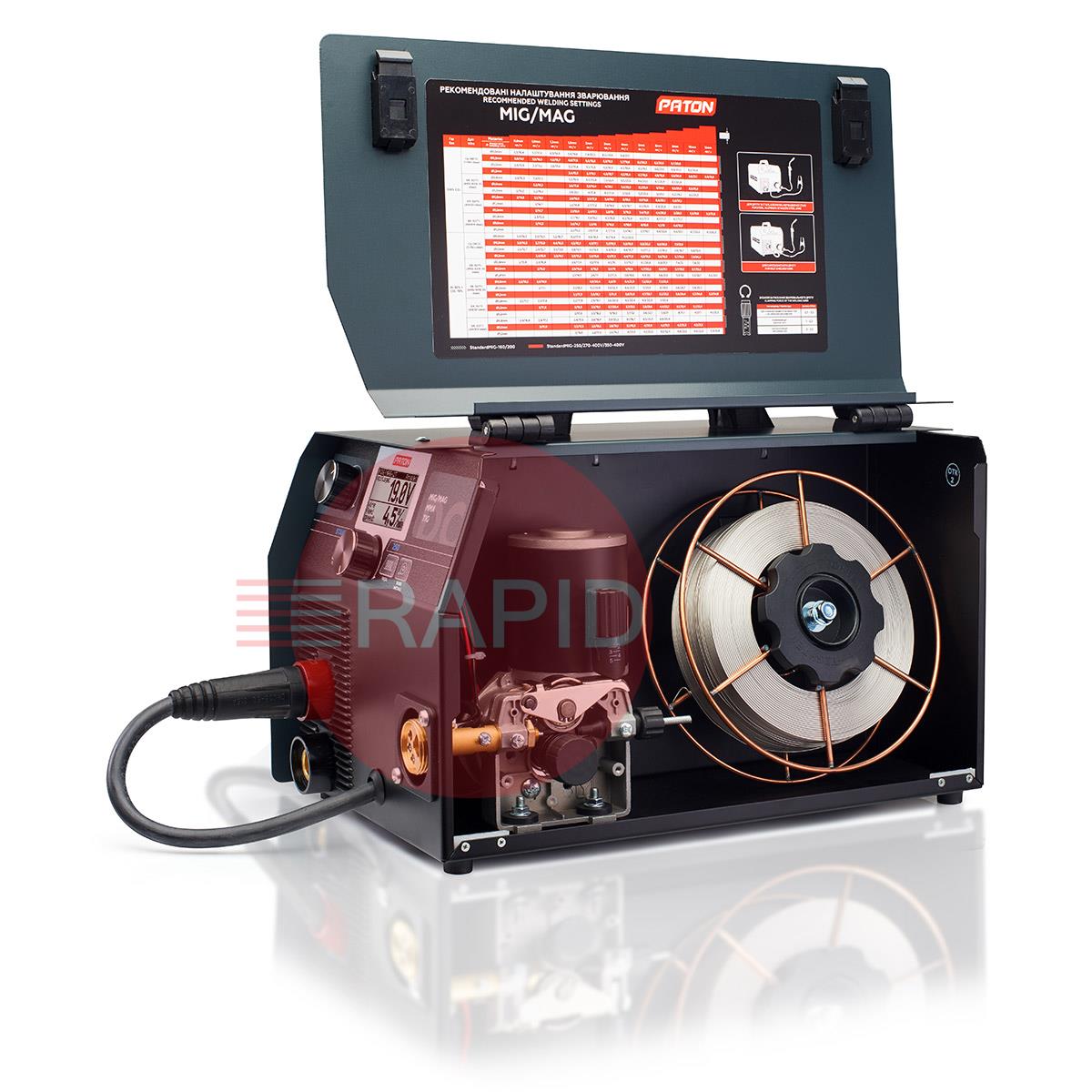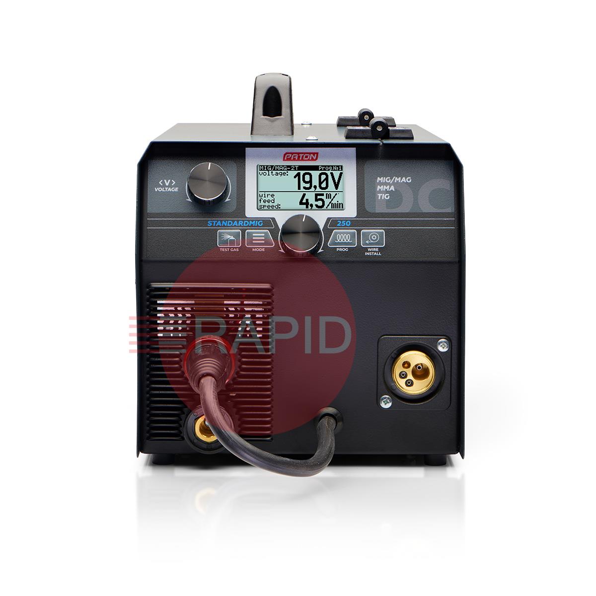 The Paton StandardMIG 250 MIG/MAG MMA/TIG Lift welder inverter is designed for semi-automatic MIG/MAG arc welding, gas shielded TIG arc welding and manual MMA arc welding with direct current (DC), with the possibility of using the PULSE function. The StandardMIG 250 features a 45% duty cycle and a 5-year warranty.