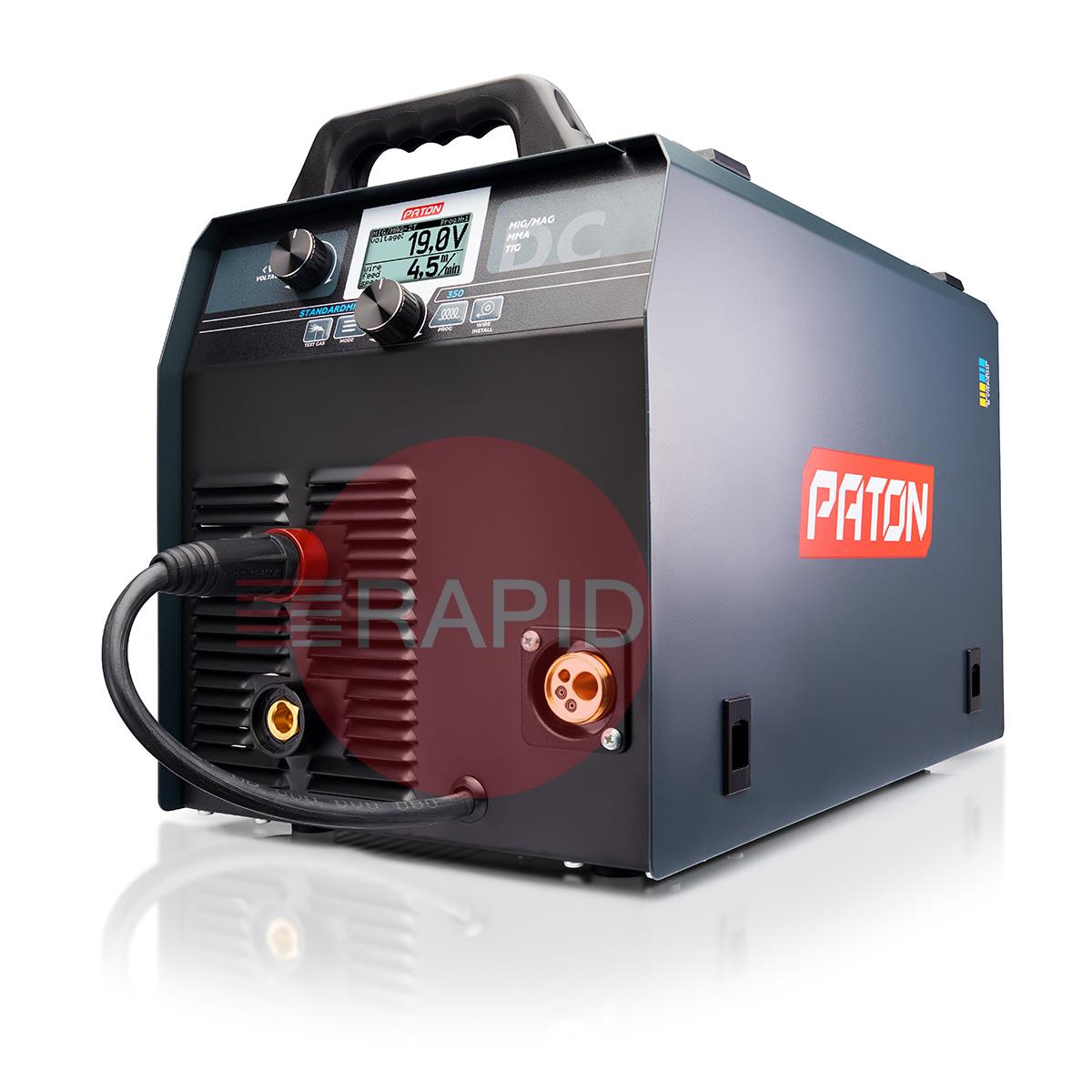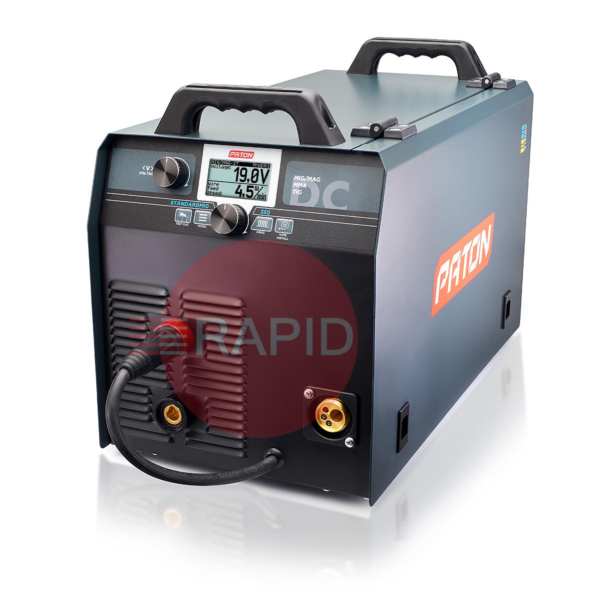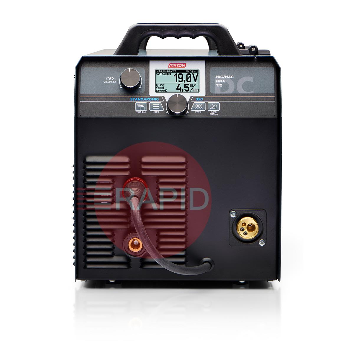 The PATON™ StandardMIG 350 400V Digital Inverter Welder is designed for semi-automatic arc welding in the MIG/MAG method, gas shielded arc welding in the TIG method and manual arc welding with covered electrode MMA, direct current (DC) with the possibility of using the PULSE function. The StandardMIG 350 benefits from a 55% duty cycle and 3-year warranty.