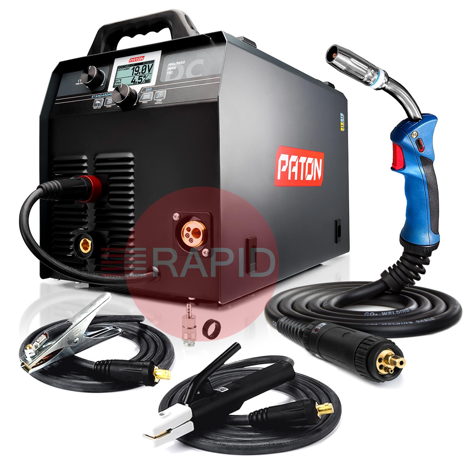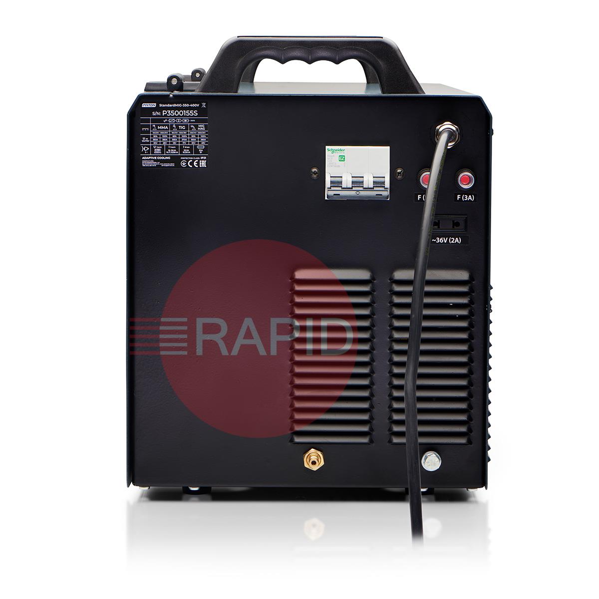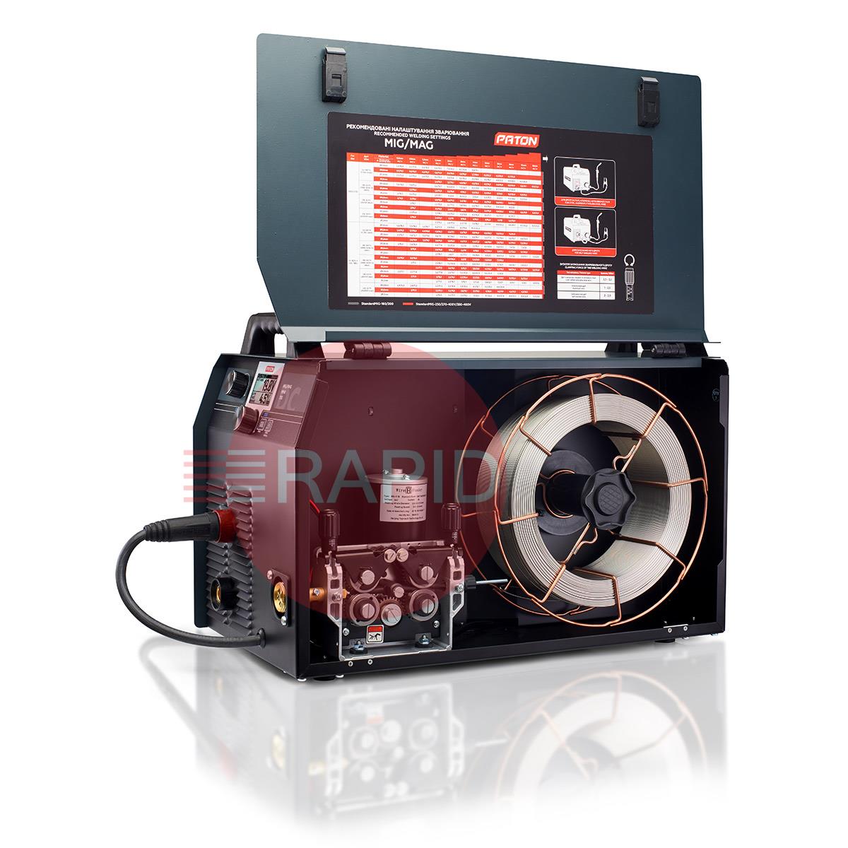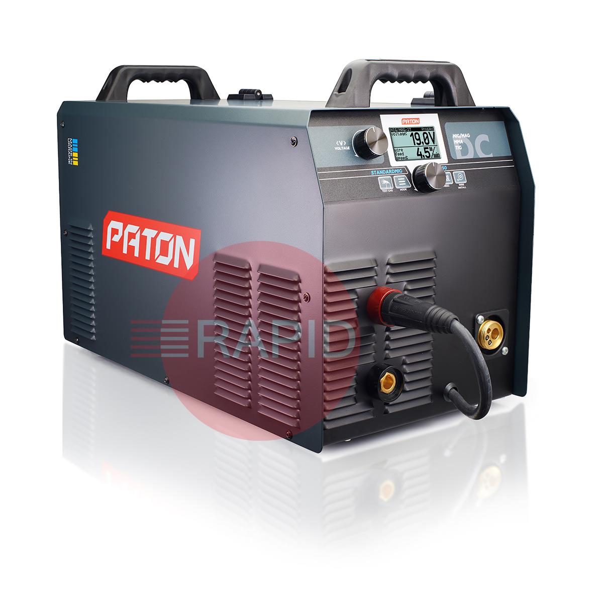 The PATON™ StandardMIG 350 400V Digital Inverter Welder is designed for semi-automatic arc welding in the MIG/MAG method, gas shielded arc welding in the TIG method and manual arc welding with covered electrode MMA, direct current (DC) with the possibility of using the PULSE function. The StandardMIG 350 benefits from a 55% duty cycle and 3-year warranty.