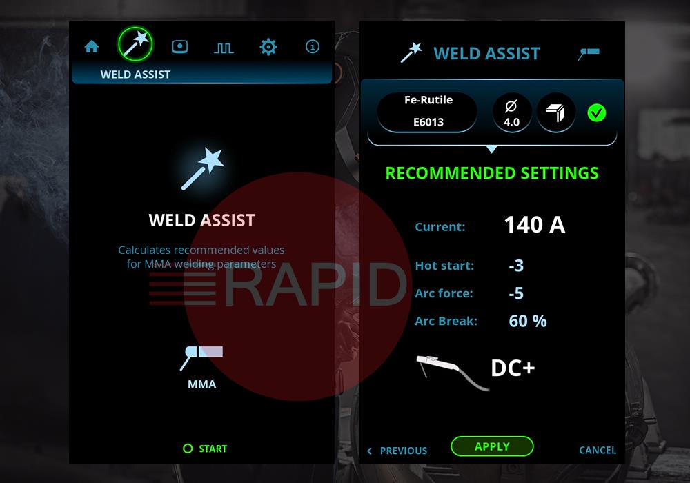 Master S 305 guarantees optimal welding performance and fast parameter setting, supported by the innovative Weld Assist menu selection tool. Weld Assist ensures suitable parameters are set for each application, regardless of your welding experience. Select the electrode type, electrode size, and joint type, and Weld Assist makes the perfect setting for you.