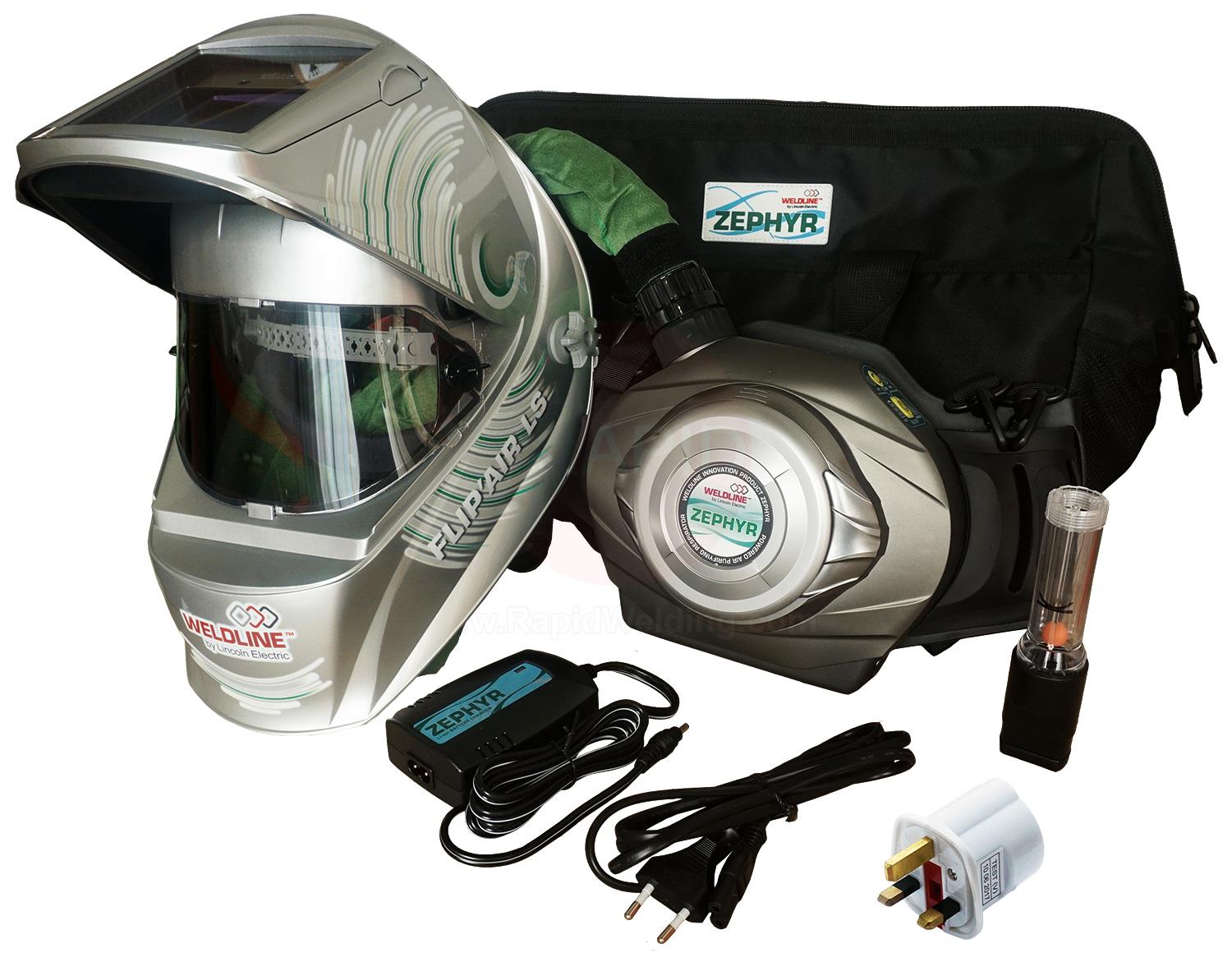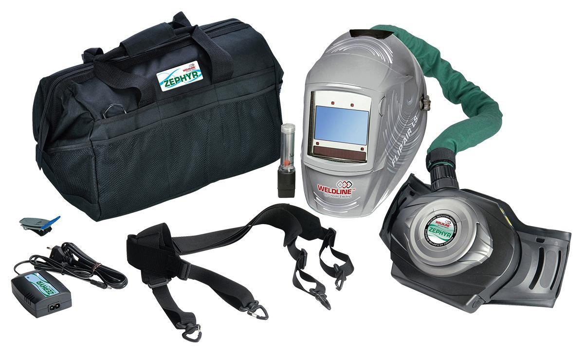 This package includes a Flip Air Helmet with 9 - 13 Auto Darkening Lens, Zephyr Airflow system, protected hose system, shoulder strap, battery charger, airflow meter, one extra filter and rugged carry bag.