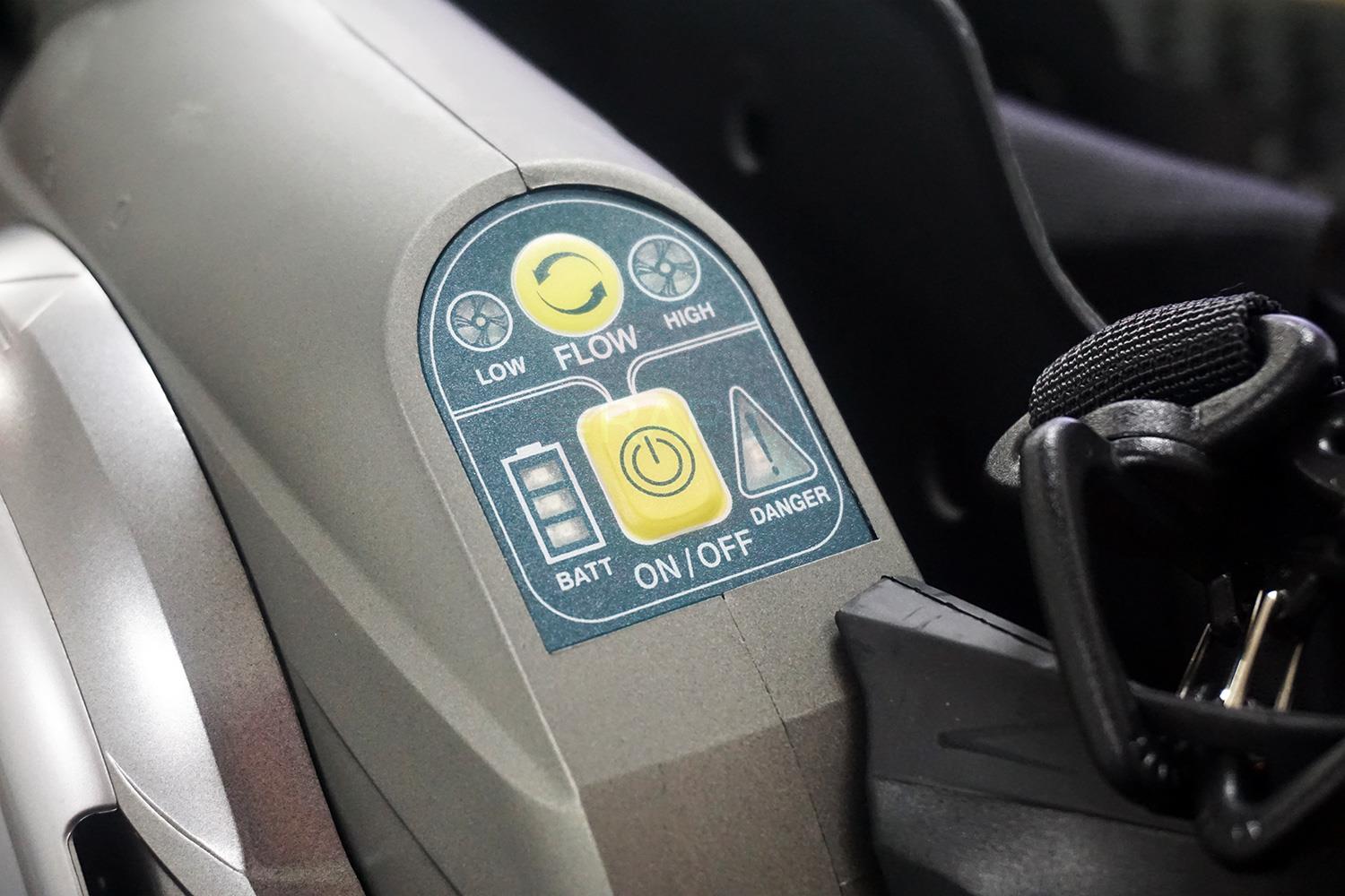• This equipment includes an indication of the chosen flow, an indication of the battery charge, and two alarms in case of flow insufficiency: a tone and a vibration. This is important for the welder who is often in a noisy environment. A specific system sends the tone through the hose to bring the sound to the welder