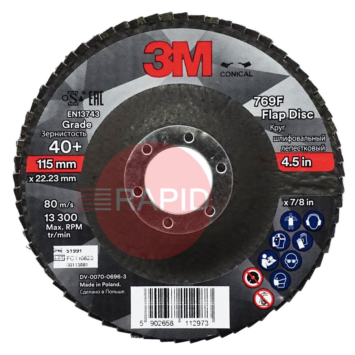 3M Silver Conical Flap Disc 769F 115mm x 22.23mm, 40+ Grit (Box of 10)
