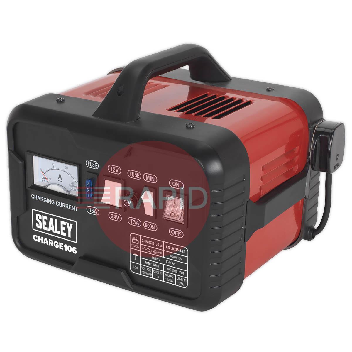 Steel case with carry handle, this single phase charger features plenty of ventilation to help maintain low transformer temperatures. A large ammeter displays rate of charge and a dash-mounted fuse provides polarity protection in the event that clips are connected incorrectly. Rocker switches control variable output to the battery to maintain peak condition. Suitable for regular and low maintenance batteries.