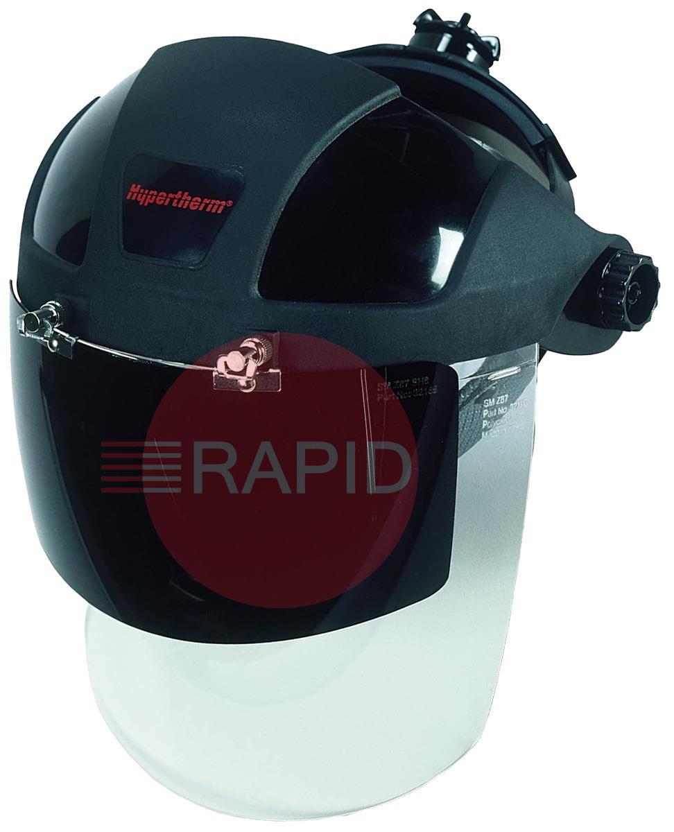 Hypertherm’s Operator Face Shield Helmet has a flip-up mini visor designed to protect against grinding metal and other metal cutting. These face shield helmets offer lightweight protection and consist of adjustable halo headgear.