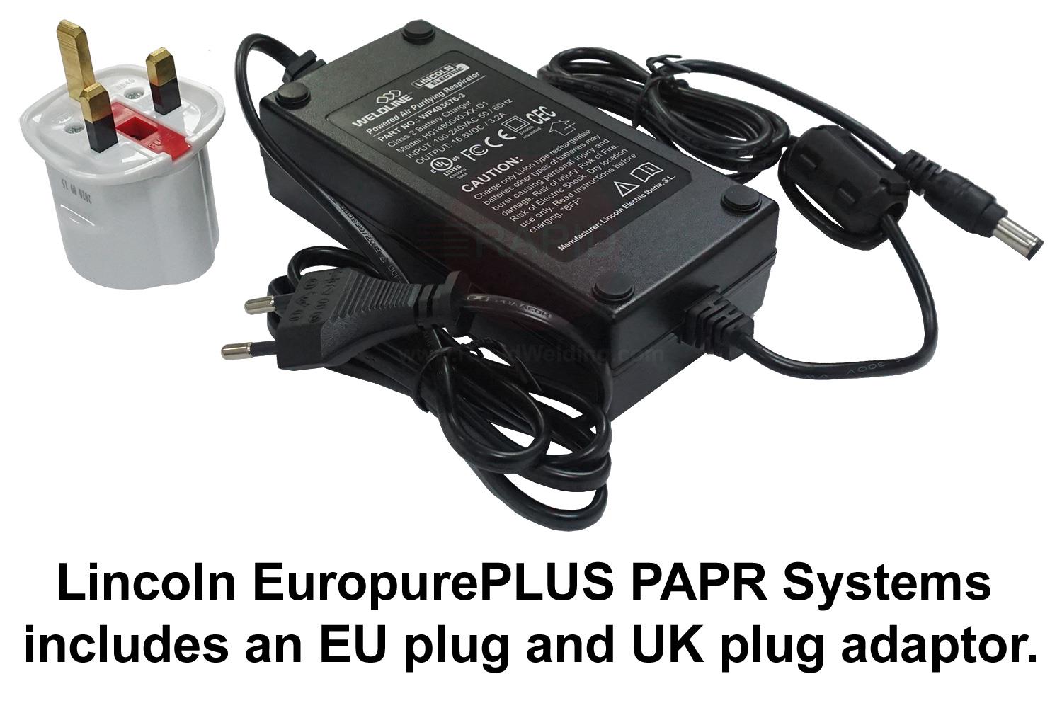 **Consists of the Europure PLUS welding helmet, auto darkening lens with shades 8-13 and PAPR system. Also included are five front cover lenses, two inner cover lenses, one side lens cover, a pre-filter, a filter, a lithium battery, a spark screen, a 100-240VAC battery charger, a hose with cover, a padded belt, head covering, shoulder straps, an airflow indicator and duffle bag.**