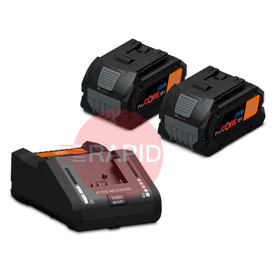 Two ProCORE Li-Ion batteries with high-power cells with GAL 18V-160 rapid charger. Short charge times thanks to the high charge current of 16A, Power Boost charge mode, active air cooling and process-controlled charge management. With charge status indicator and fixture for mounting on the wall. For all battery packs with AMPShare or Bosch Professional 18V battery interface.